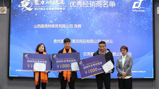 在大會頒獎環(huán)節(jié),頒獎嘉賓分別向2020有突出貢獻(xiàn)的施達(dá)經(jīng)銷商進(jìn)行頒獎,山西愛美特商貿(mào)有限公司、貴州奧麗齊清潔用品有限公司、甘肅愛科林科技有限公司榮獲“2020施達(dá)優(yōu)秀經(jīng)銷商”稱號。
