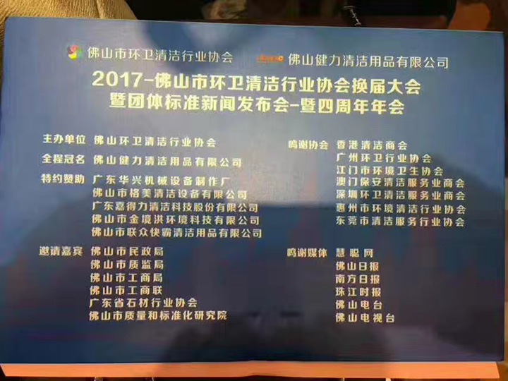 佛山市環(huán)衛(wèi)清潔行業(yè)協(xié)會(huì)換屆大會(huì),團(tuán)體標(biāo)準(zhǔn)新聞發(fā)布會(huì),四周年年會(huì)于2017-7-28在佛山當(dāng)?shù)嘏e行,大會(huì)由佛山健力清潔用品有限公司全程冠名贊助,會(huì)議內(nèi)容包括:協(xié)會(huì)新領(lǐng)導(dǎo)班子選舉、未來(lái)清潔行業(yè)發(fā)展展望、清潔工具及設(shè)備等展示、晚宴活動(dòng)。
